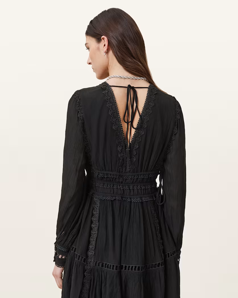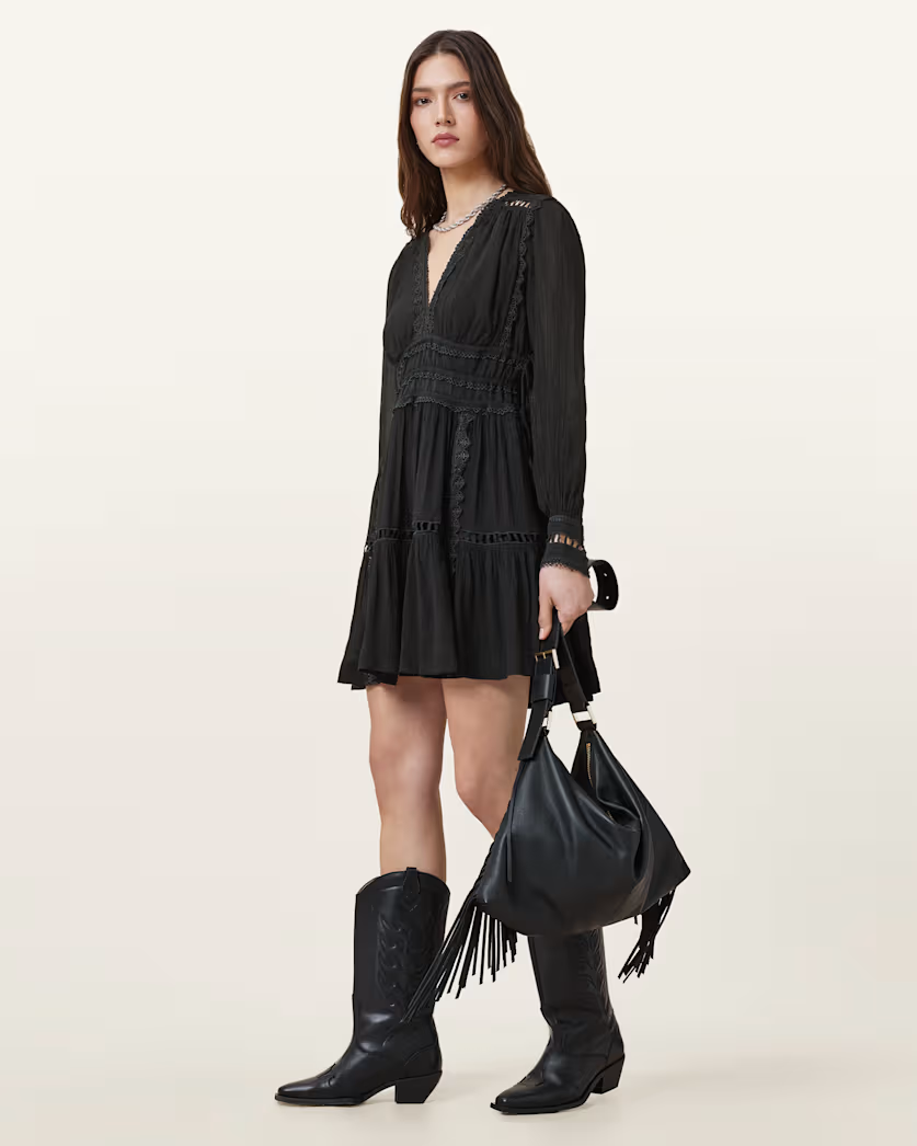 שמלת מיני לנשים מבית המותג אולסיינטס. בגזרה משוחררת, עם מפתח וי, שרוולים ארוכים, עם הצרה במותן. וקשירה בגב.