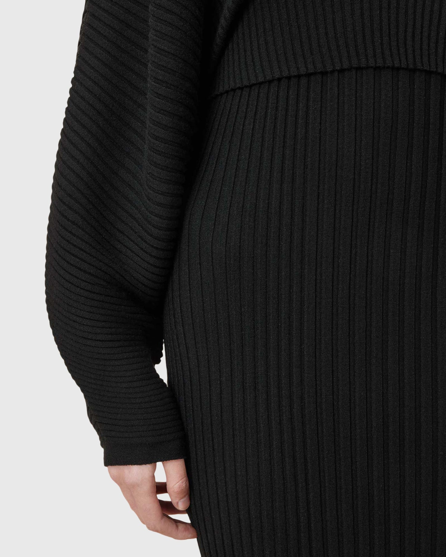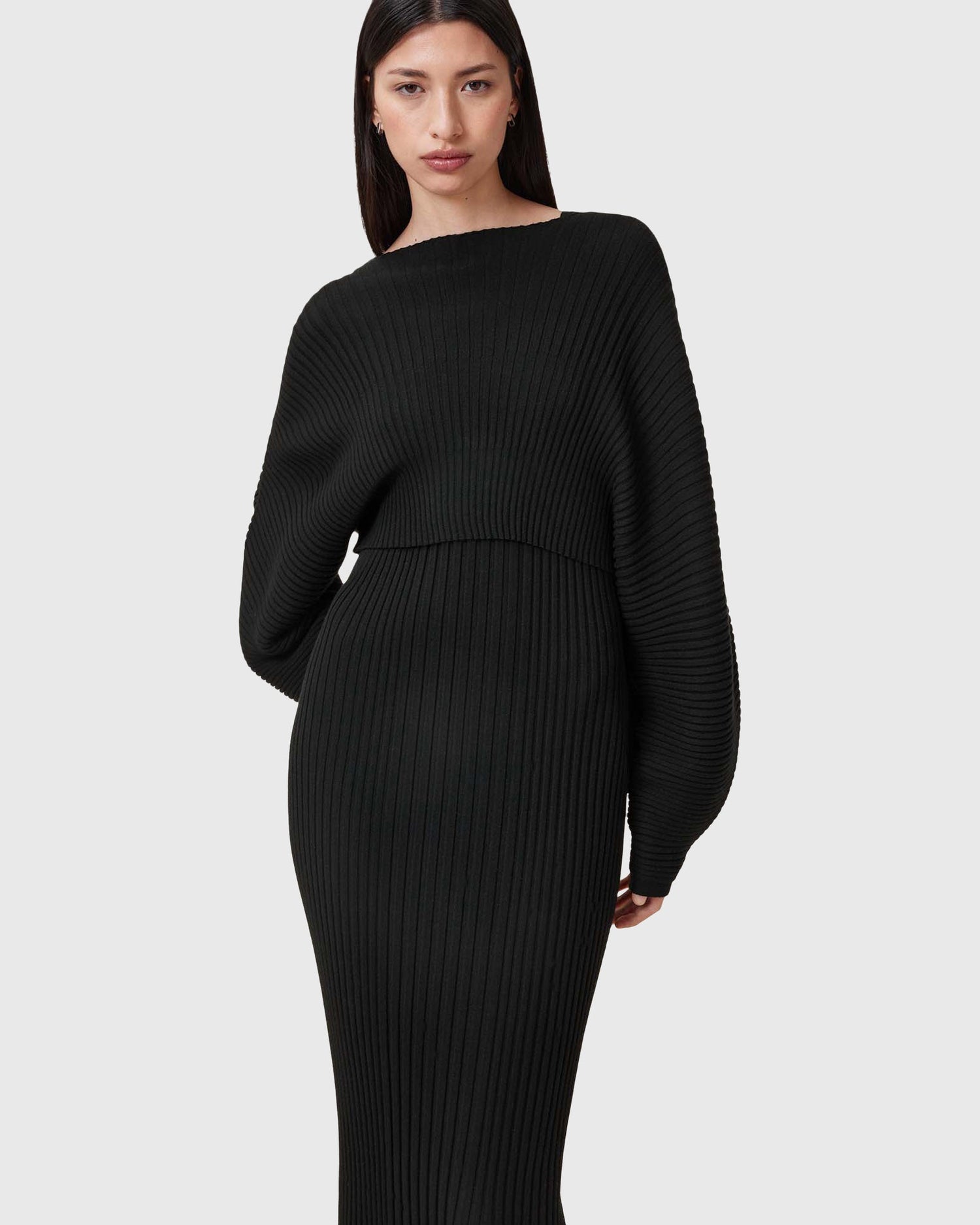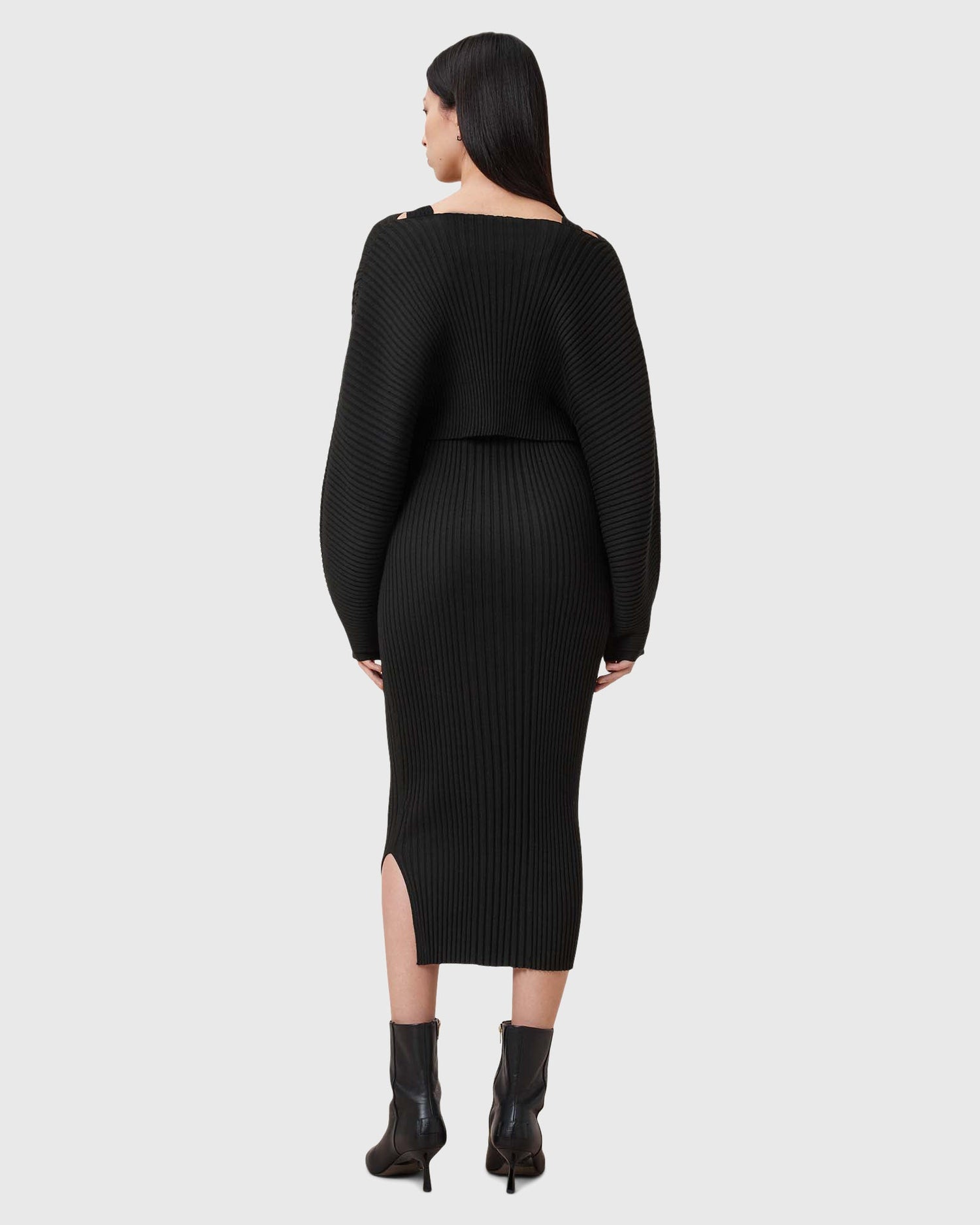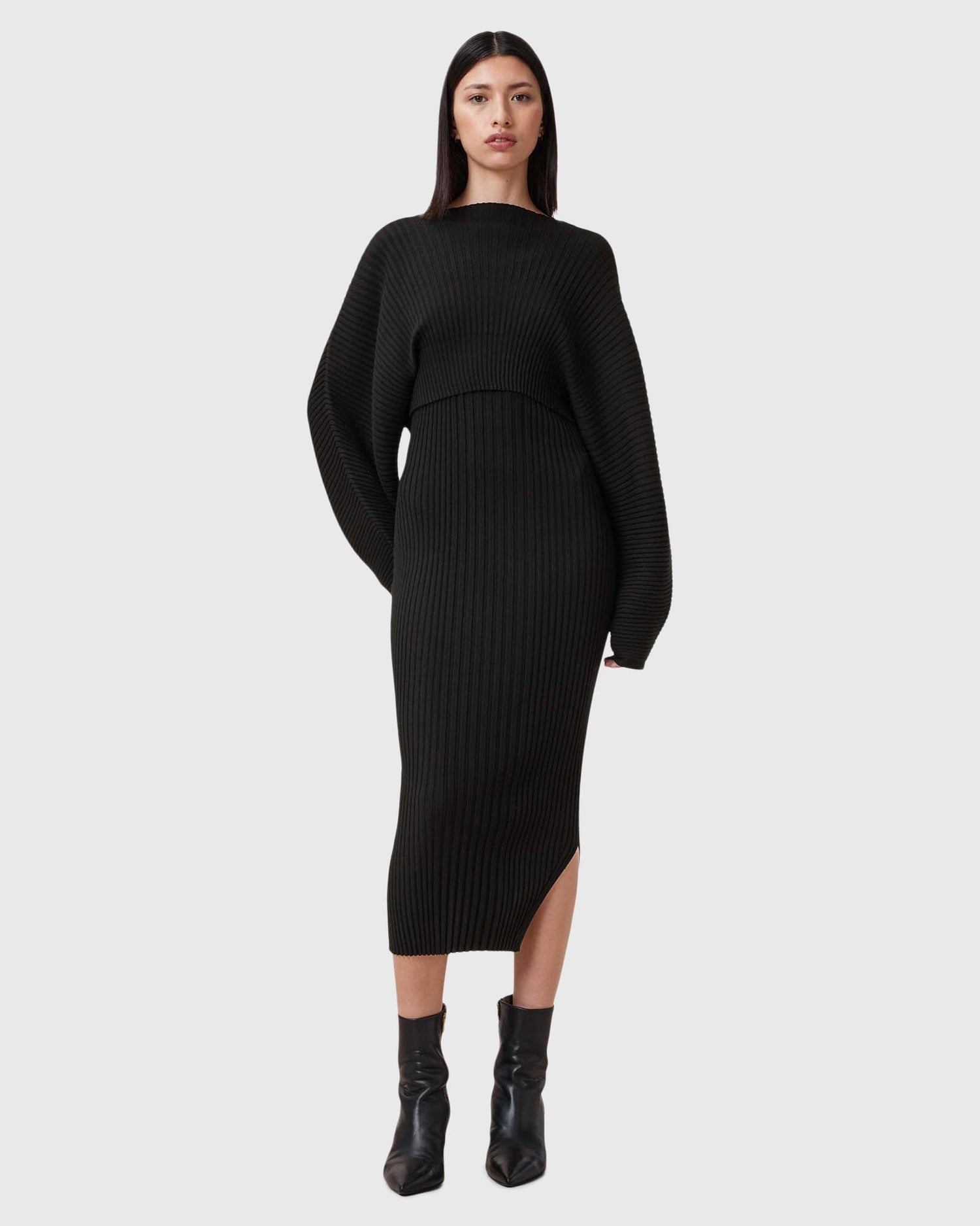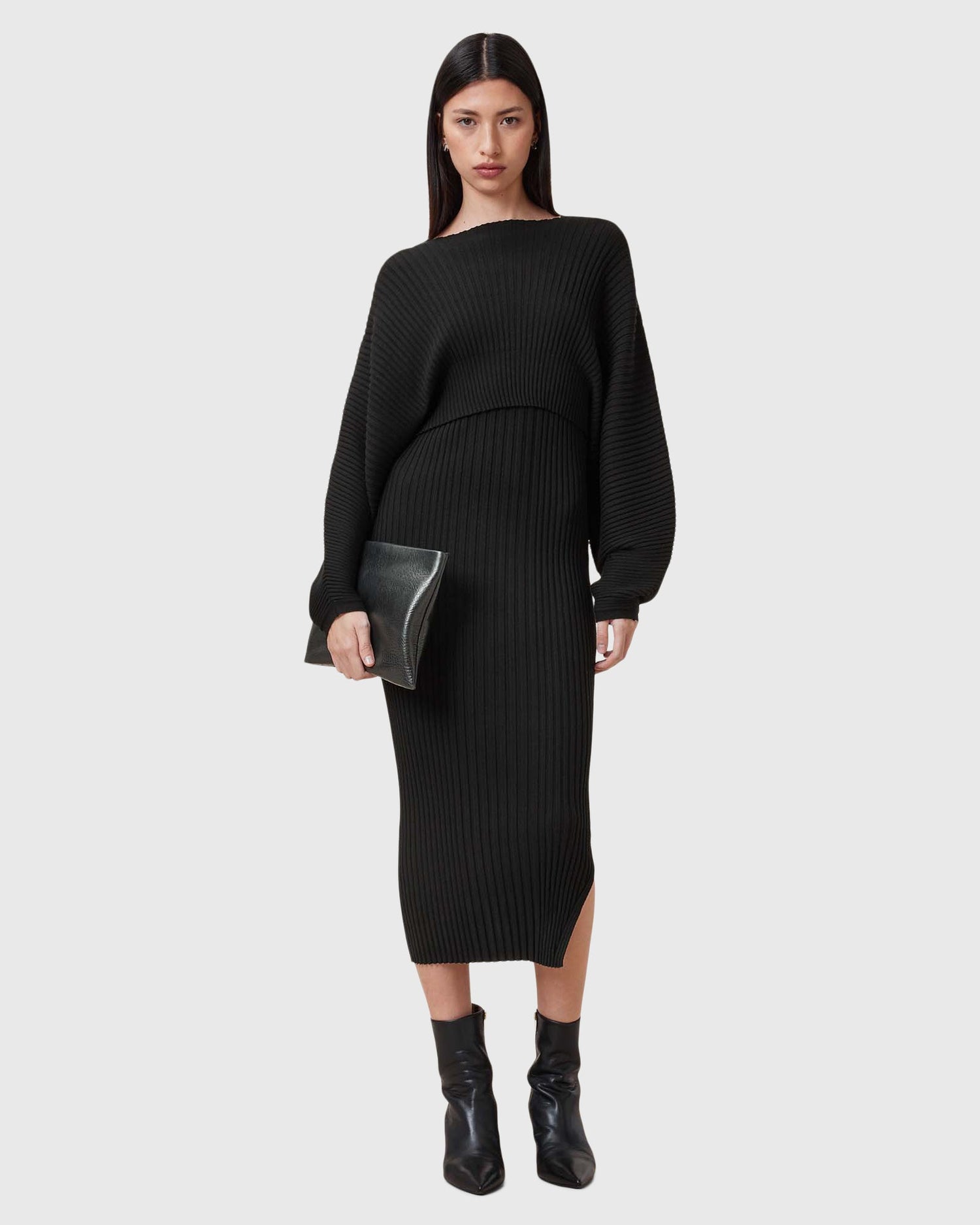 שמלת מידי 2 ב-1 לנשים מבית המותג אולסיינטס. גזרת סלים, השמלה מגיעה עם סריג קרופ שניתן להורדה, בעל שרוולים רחבים וארוכים. שמלה וורסטילית שניתן ללבוש כשחם וגם כשמתקרר. עם שסע צדדי קטן.