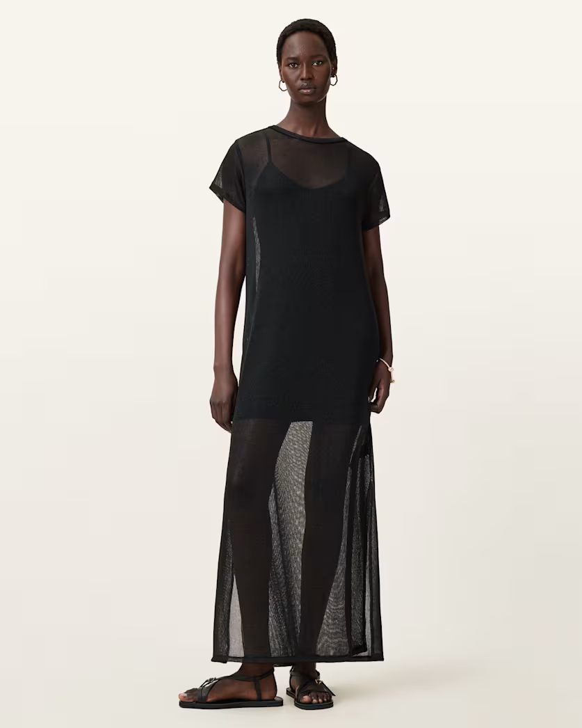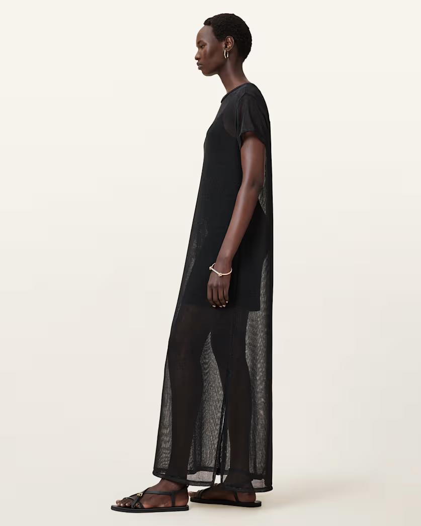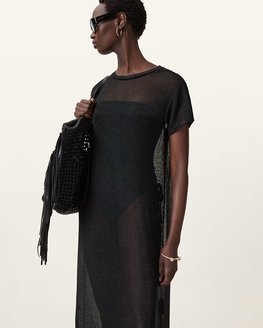 שמלת מקסי שקפקפה מנצנצת לנשים מבית המותג אולסיינטס. בגזרה משוחררת, עם מפתח עגול, שרוולים קצרים. עשויה מבד שקוף ומנצנץ.