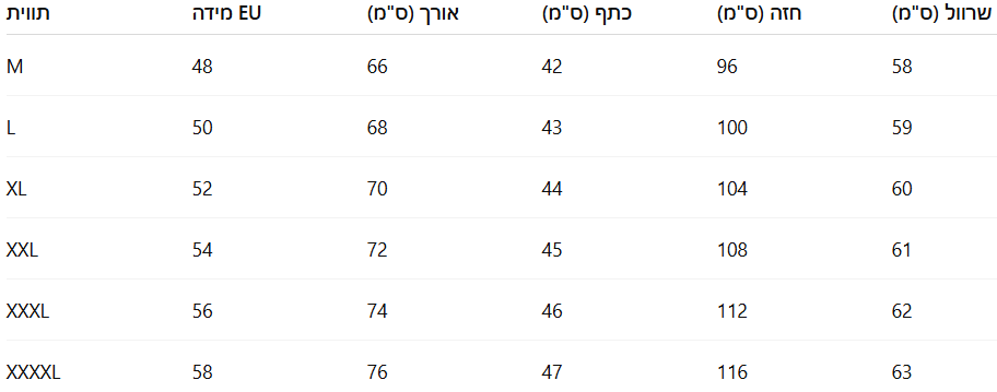מידות: M, L, XL, 2XL, 3XL, 4XL