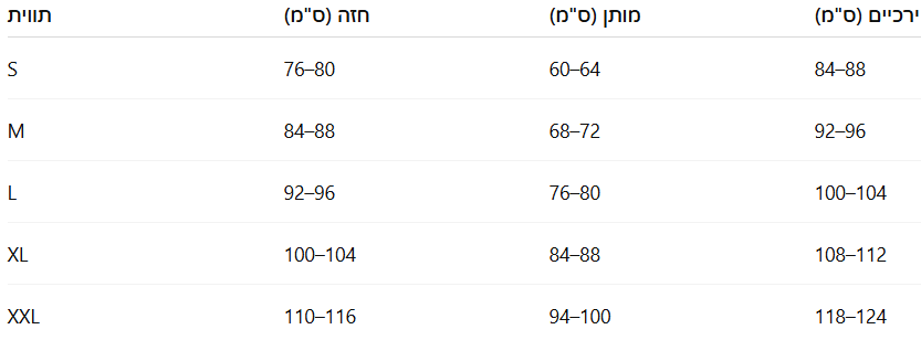 מידות: S (2-4), M (6-8), L (8-10), XL (10-12), XXL (14-16)